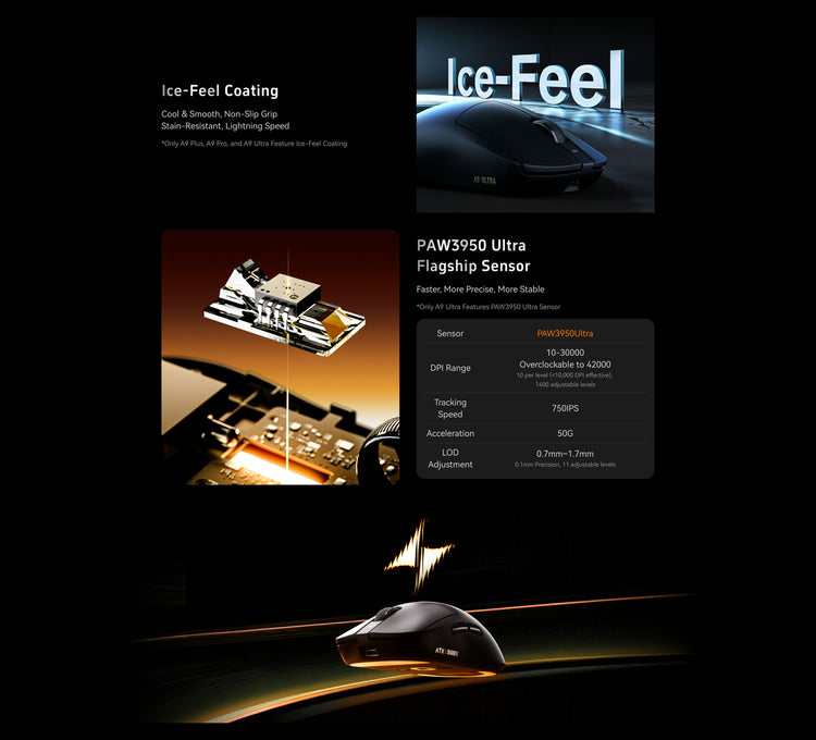 Powered by the high-performance Nordic 52840 MCU (available in select models), combined with Gen-2 SmartSpeed Wireless Transmission Technology and ATK ApexShark professional gaming firmware, it achieves an ultra-low 0.3993ms click latency, minimizing input lag and delivering a seamless control experience, giving you the edge in competitive gaming.