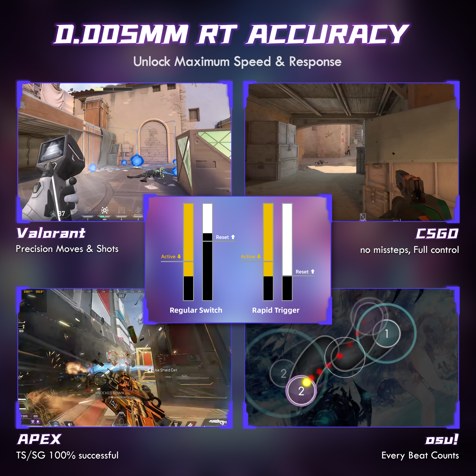 This rapid trigger gaming keyboard supports web-driven adjustments, enabling bespoke key functions that significantly enhance operational efficiency. Combined with its distinctive top-mounted RGB lightbox design, the driver allows free customisation of multiple dynamic lighting effects, synchronously crafting a personalised gaming environment that blends practical convenience with immersive, dazzling aesthetics.
